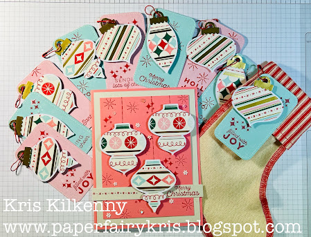November's Paper Pumpkin Kit was so cute! It came with 8 stockings, the stamp set and the pieces to make 8 tags, with 3 cut out ornaments left over. I used the leftover pieces to make this card. While this kit is no longer available to purchase, Paper Pumpkin subscribers can get the refill kit while supplies last. It does not come with the stamp.